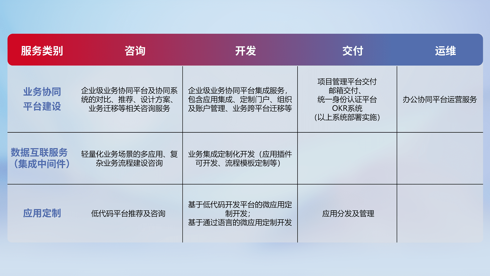 针对钉钉、、企微、、IDaas等平台级产品提供产品的规划、、、方案、、、、交付、、、定制化开发等服务,,实现如统一协同办公、、智能客户服务、、、混合会议管理、、智能数据查询、、、等业务场景,,,实现数字化转型。。。